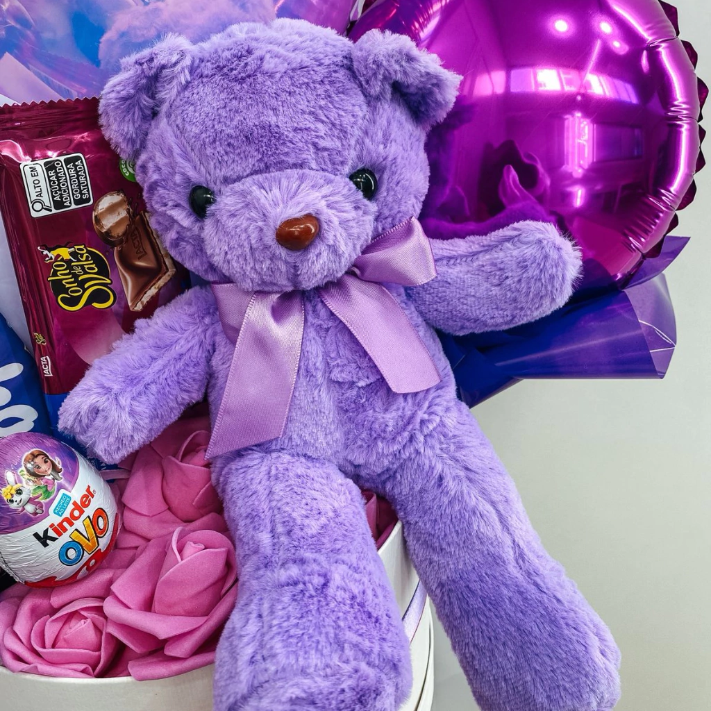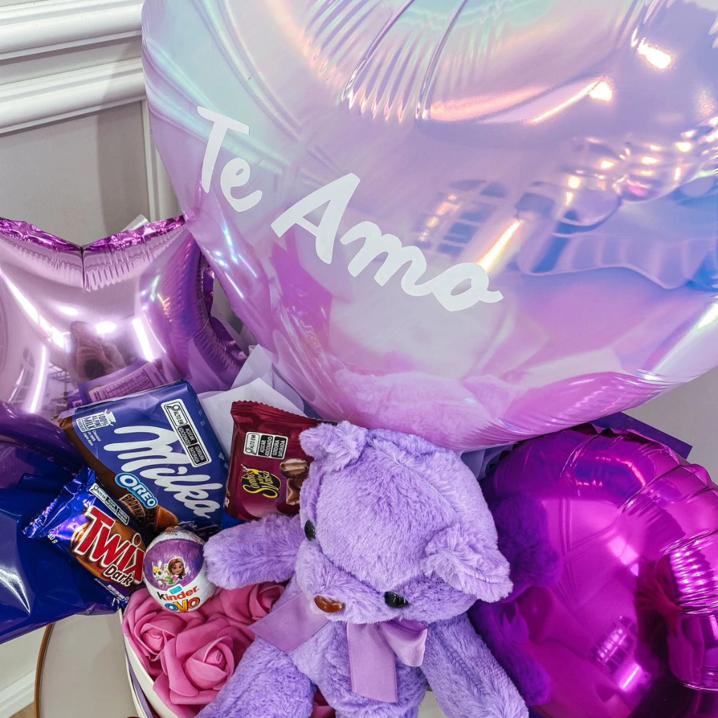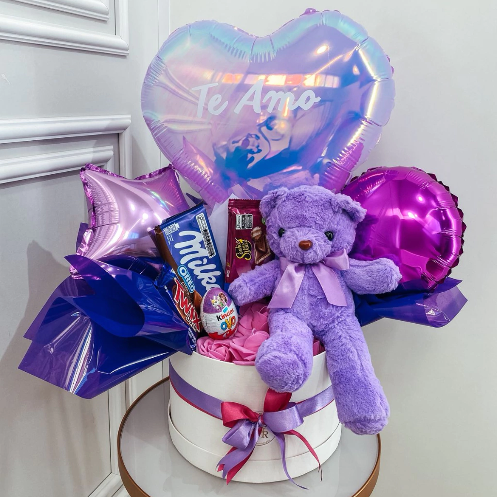 Declare seu amor com o adorável Box Amor Púrpura! Com um ursinho de pelúcia lilás super fofo, chocolates deliciosos e balões em tons metálicos com a mensagem “Te Amo”, esta caixa é perfeita para presentear em ocasiões românticas ou simplesmente para lembrar alguém do quanto é especial. Um mimo inesquecível que transmite amor e doçura em cada detalhe.